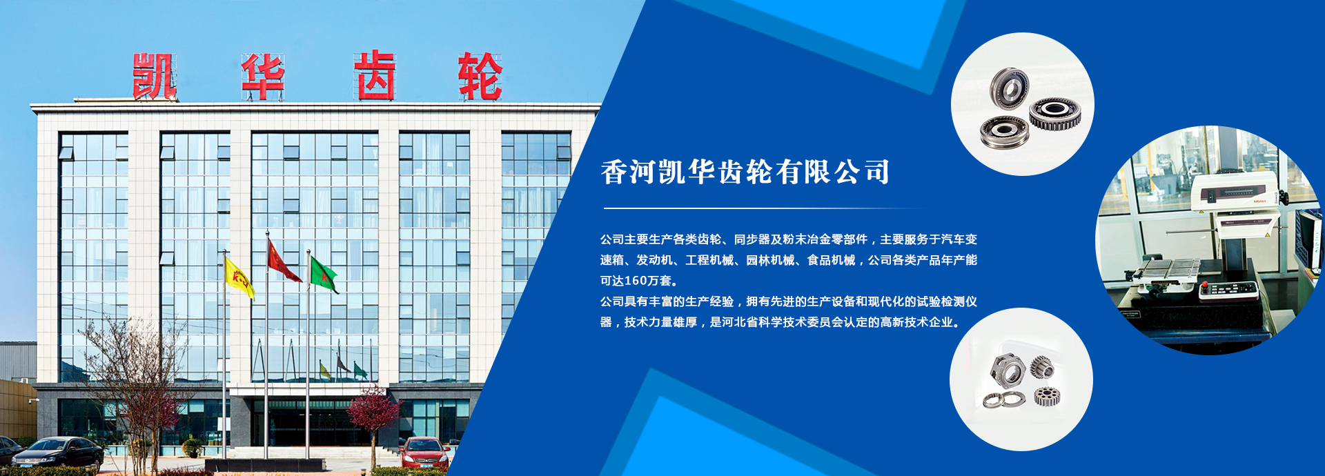 香河凱華齒輪有限公司是一家民營企業(yè),位于香河經(jīng)濟開發(fā)區(qū),毗鄰京津,交通便利。公司占地面積7萬平米,注冊資本1360萬元,現(xiàn)有員工400余人,其中技術(shù)質(zhì)量工程人員70余名,擁有中高級職稱人員30余名。公司主要生產(chǎn)各類齒輪、同步器及粉末冶金零部件,主要適配汽車變速箱與發(fā)動機,公司各類產(chǎn)品年產(chǎn)能可達160萬套。